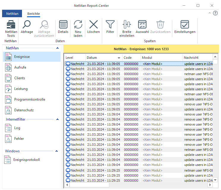 Wie Sie Ihre Protokollabfrage filtern, lesen Sie im Kapitel Berichte anzeigen im Report Center.