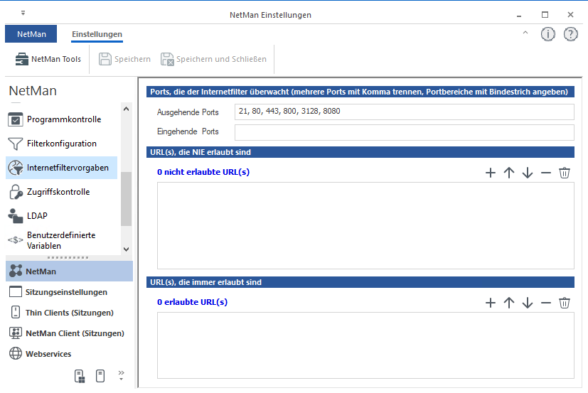 Auf der Seite Internetfiltervorgaben konfigurieren Sie globale Vorgaben des NetMan Internetfilters.